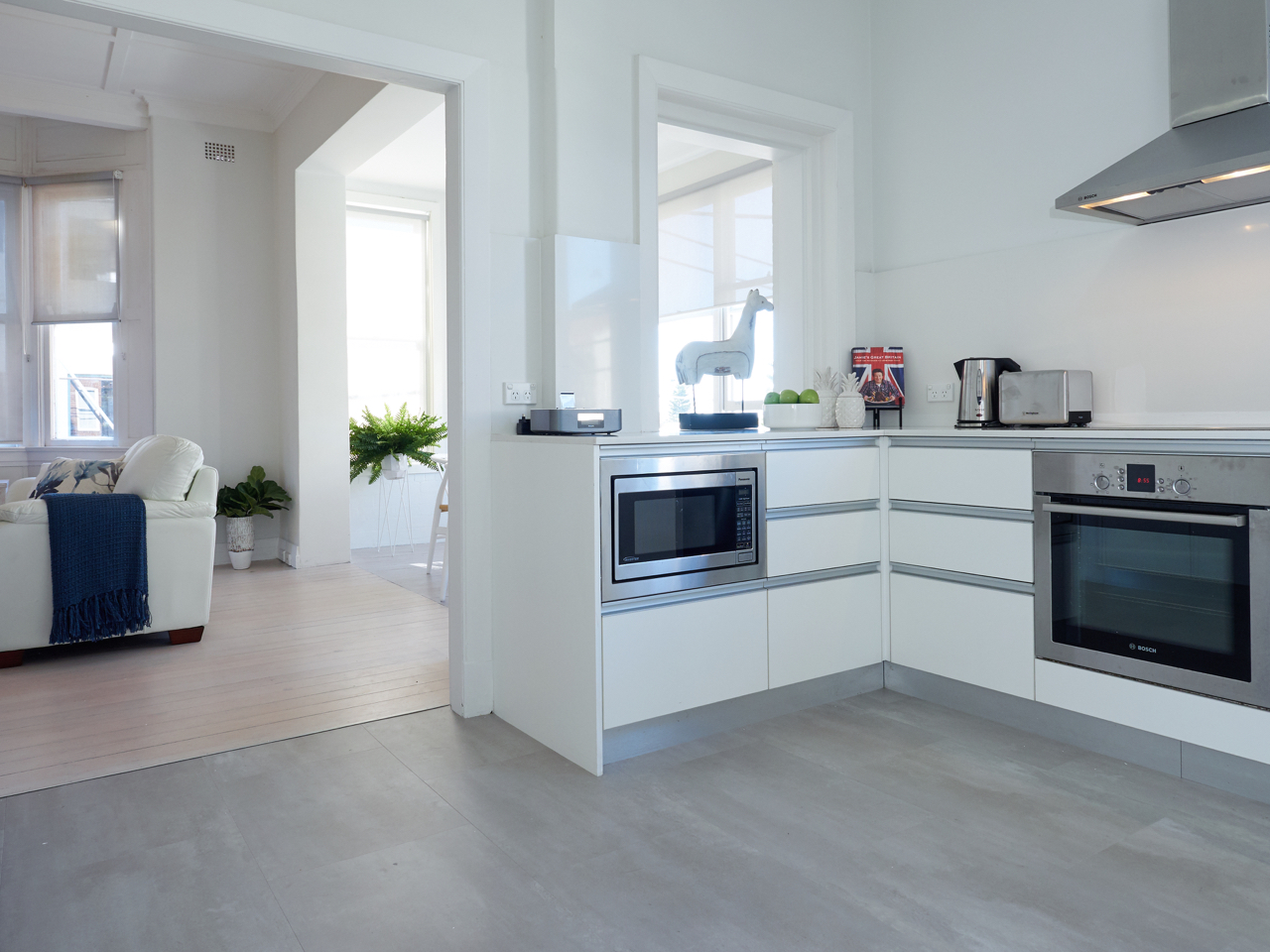 The recently renovated interiors offer a beautifully designed open-plan layout which includes a dining area with room for the whole family. The well equipped kitchen is sleek with Caesar stone bench tops, stainless steel Bosch appliances and provides an ideal area for those who love to cook.