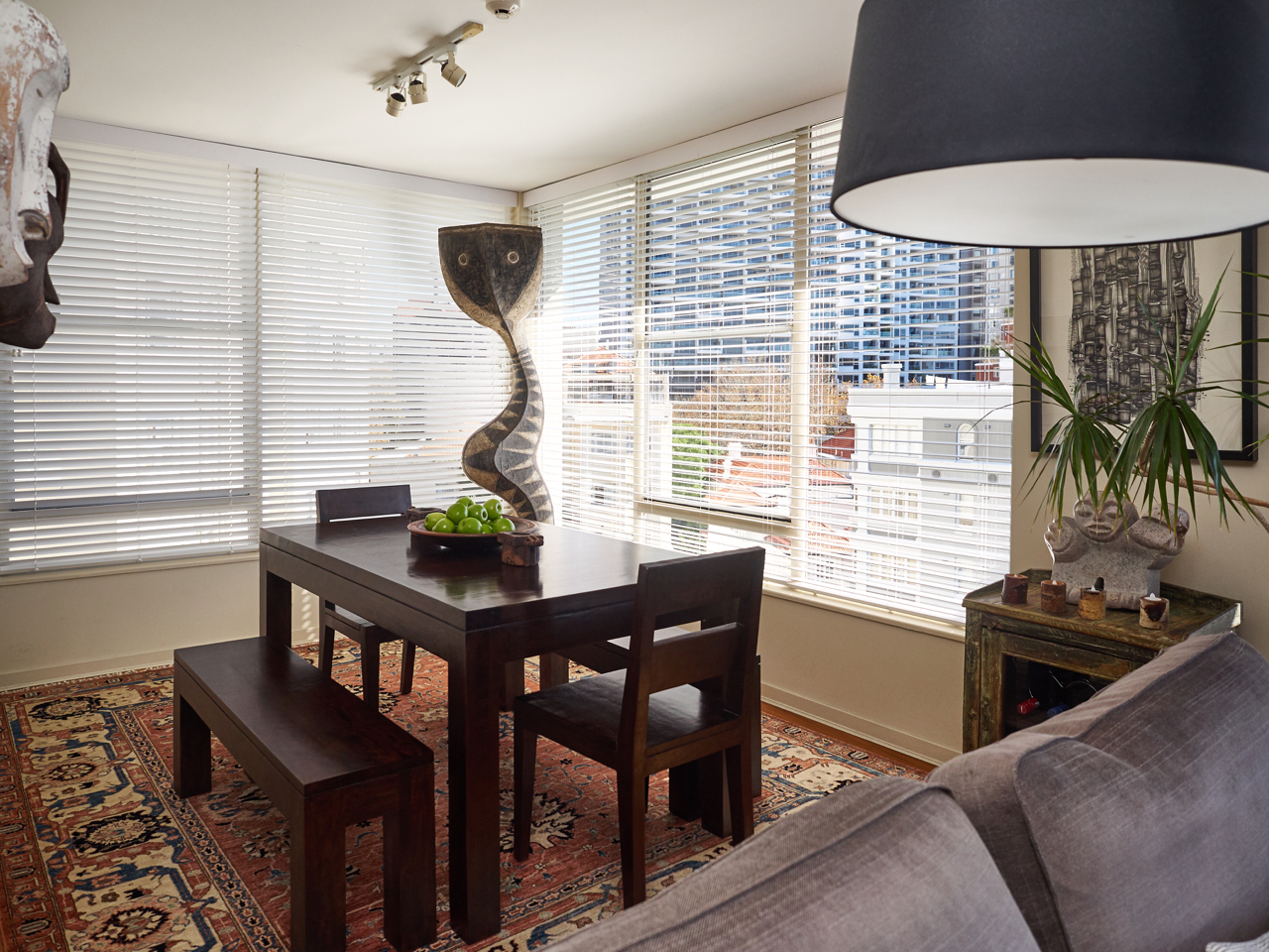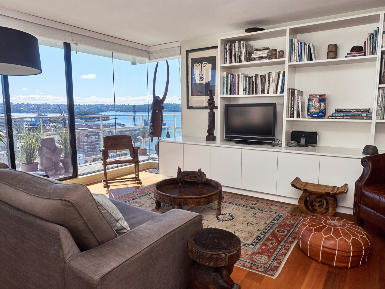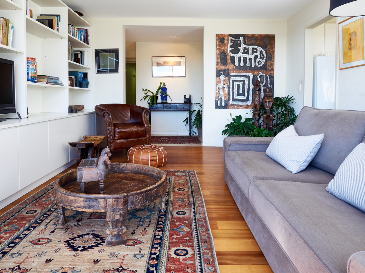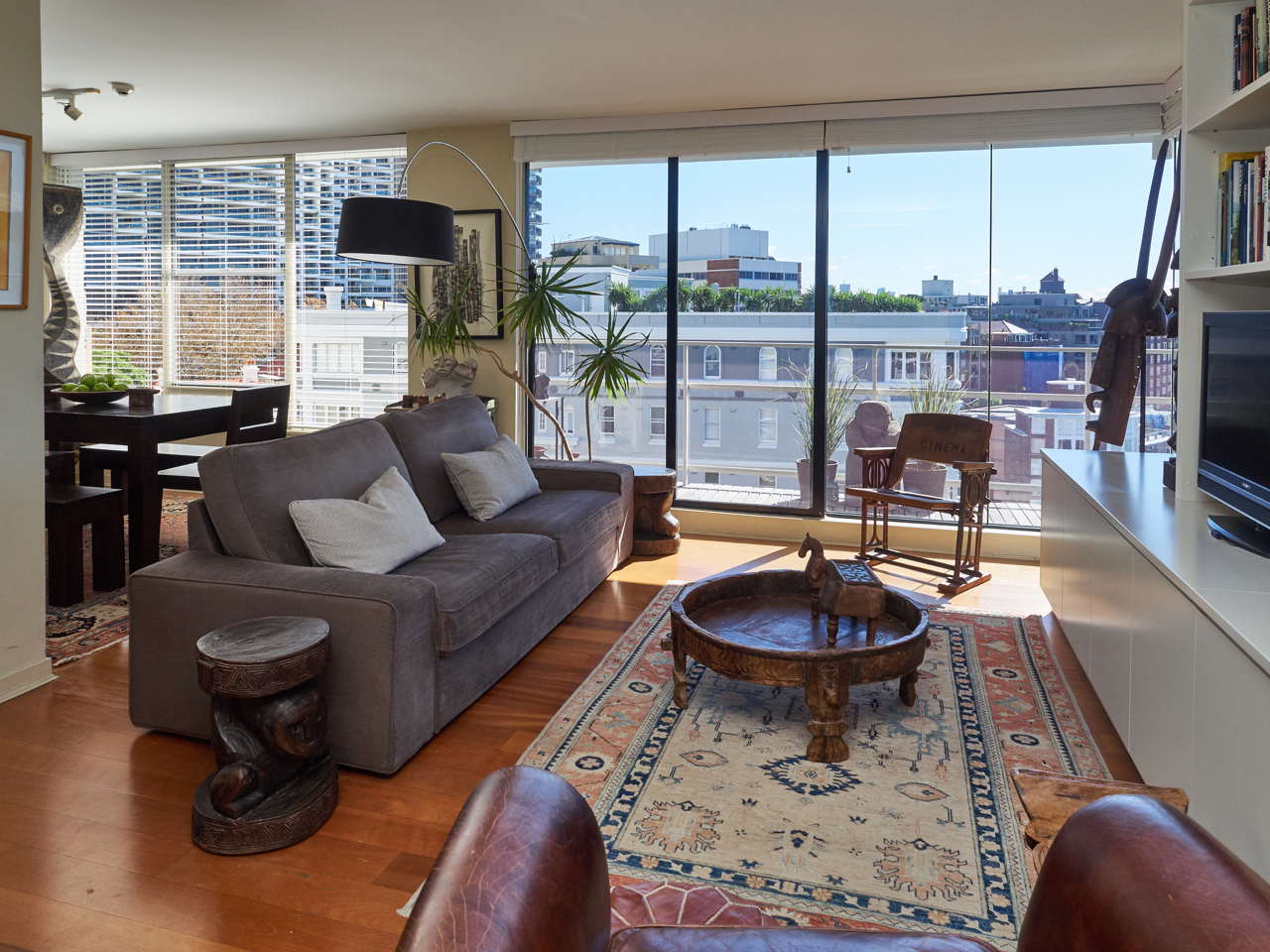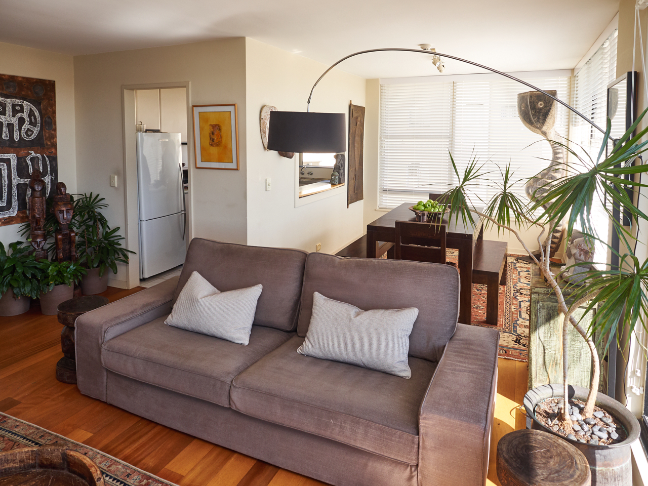 The open plan apartment is flooded with natural light and boasts large glass doors that open up onto the balcony. With timber flooring throughout and an eclectic mix of art and furniture the owners have created a wonderfully relaxing space for you to enjoy.